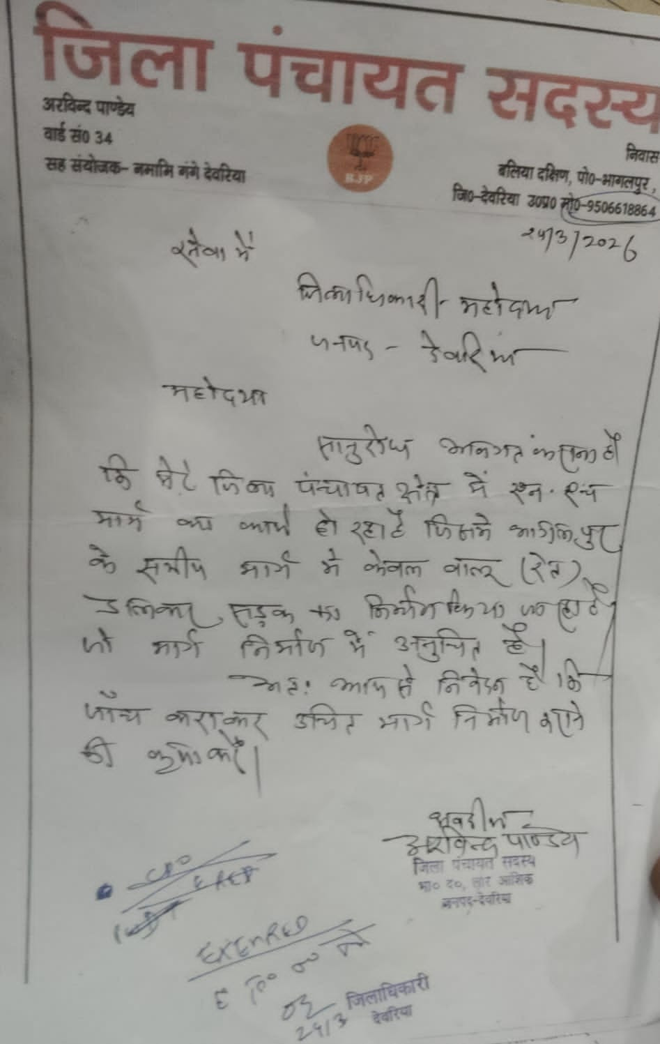 देवरिया।जनपद जनपद में हो रहे एच एन मार्ग निर्माण को लेकर जिला पंचायत दक्षिणी भागलपुर के सदस्य अरविंद पांडे जो इनके जिला पंचायत क्षेत्र में पड़ता है को लेकर जिला अधिकारी दिव्या मित्तल को पत्रक देते हुए हो रहे निर्माण कार्य में बालू के प्रयोग को लेकर आपत्ति दर्ज कराई जिस पर जिलाधिकारी महोदय ने हो रहे मार्ग निर्माण को लेकर जांच का आदेश दे दिया है जिला पंचायत सदस्य अरविंद पांडे का कहना है कि चल रहे निर्माण कार्य स्थल पर पहुंच कर मैंने देखा कि सड़क के निर्माण में केवल बालू का ही प्रयोग किया जा रहा है निर्माण कार्य कर रहे विनोद सिंह से पूछे जाने पर बताया कि बालू से ही सड़क अच्छा बनता है अरविंद पांडे का कहना है कि सड़क मजबूत और सुंदर बने सड़क निर्माण में किसी तरह की लापरवाही न वर्ती जाय जिससे लोगों को आने-जाने की सुविधा मिल सके यह सड़क बलिया जनपद और बिहार को जोड़ता है इसलिए इसकी मजबूती आवश्यक है इस मार्ग से हजारों वाहन प्रतिदिन आते जाते हैं।