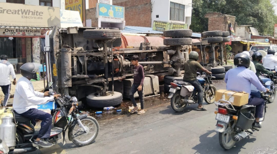 शीरा लदा ट्रैक्टर पलटा चालक गंभीर घायल ट्रैक्टर-ट्रॉली को बचाने में हुआ हादसा, सड़क पर फैले शीरे से...