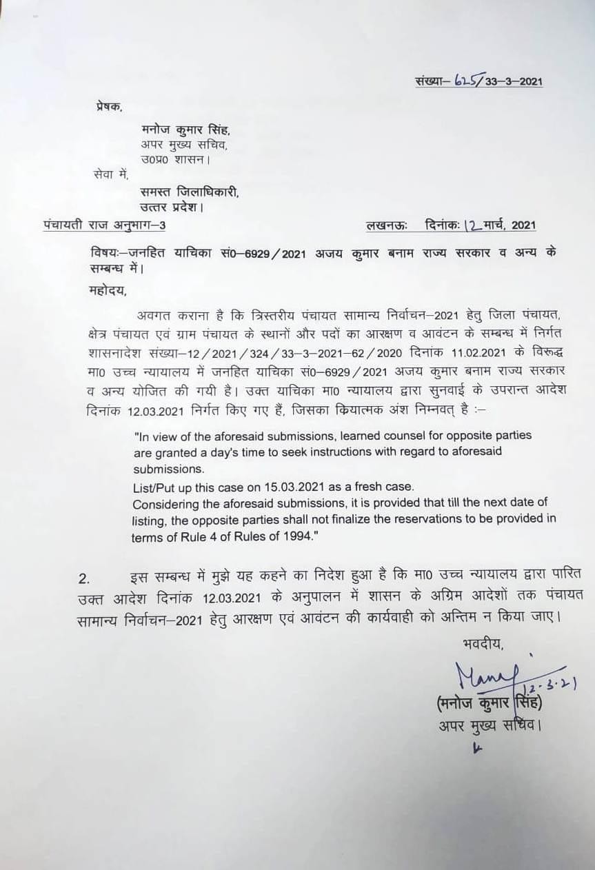 इलाहाबाद हाई कोर्ट की लखनऊ खंडपीठ के फैसले के बाद अपर मुख्य सचिव पंचायतीराज मनोज कुमार सिंह ने सभी जिलाधिकारों को पत्र लिखकर निर्देश दिए हैं कि शासन के अगले आदेश तक पंचायत सामान्य निर्वाचन 2021 के लिए आरक्षण व आवंटन की प्रक्रिया को अंतिम रूप न दिया जाए। पंचायत चुनाव में जिला पंचायत, क्षेत्र पंचायत और ग्राम पंचायत के स्थानों और पदों का आरक्षण व आवंटन के लिए 11 फरवरी, 2021 को अधिसूचना जारी की गई, जिसके विरुद्ध हाई कोर्ट में याचिका दाखिल की गई थी।