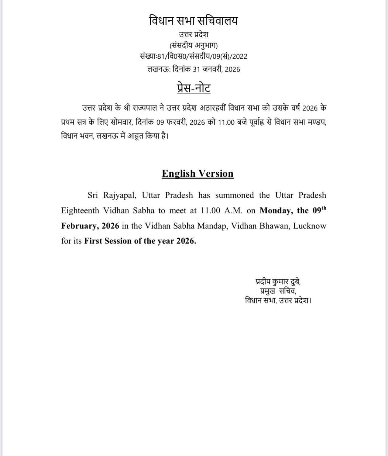 लखनऊ: उत्तर प्रदेश विधानमंडल का बजट सत्र 9 फरवरी 2026 (सोमवार) को सुबह 11 बजे से आयोजित किया जाएगा। सत्र की औपचारिक शुरुआत राज्यपाल आनंदीबेन पटेल के अभिभाषण (Governor’s Address) के साथ होगी, जिसमें वह सरकार की प्राथमिकताओं और आगामी कामों पर प्रकाश डालेंगी।