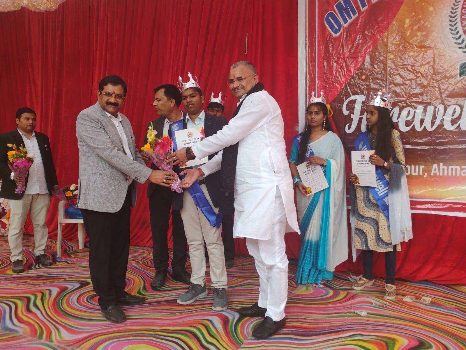 दीदारगंज -आजमगढ़ । मार्टीनगंज तहसील क्षेत्रांतर्गत मोलनापुर अहमद बख्श फुलेश स्थित ओमप्रकाश मिश्र इंटर कालेज के कक्षा 12वीं के छात्र छात्राओं का फेयरवेल सेरेमनी कार्यक्रम शुक्रवार को दोपहर में विविध सांस्कृतिक कार्यक्रमों के बीच हर्षोल्लास पूर्ण वातावरण में सम्पन्न हुआ। कार्यक्रम का शुभारम्भ मुख्य अतिथि निवर्तमान जेल अधीक्षक अम्बेडकरनगर डा0शशिकांत मिश्र व संस्थान के चेयरमैन कृष्ण कांत मिश्र के द्वारा गणेशजी व मां सरस्वती व स्व0ओमप्रकाश मिश्र के चित्र पर माल्यार्पण कर समक्ष दीप प्रज्जवलन कर किया गया, तत्पश्चात इंटर कालेज के प्रधानाचार्य आलोक शुक्ल के द्वारा मुख्य अतिथि तथा संस्थान के चेयरमैन का माल्यार्पण कर बुके देकर स्वागत किया गया। इसके बाद छात्र छात्राओं के द्वारा सरस्वती वंदना,गणेश वंदना, स्वागत गीत, समूह नृत्य,एकांकी,गीत,समूह नृत्य हम वक्त बदल देंगे हम जज़्बात बदल देंगे , छठ पूजा गीत ,गीत नज़्म, कविता, एकांकी स्वच्छता अभियान आदि की मनमोहक प्रस्तुतियां पेश की गई कार्यक्रम के दौरान मुख्य अतिथि के हाथों वर्ष 2025 के वर्गवार टापर छात्र छात्राओं को प्रमाण पत्र दिया गया अंत में फेयरवेल सेरेमनी में भाग लेने वाले मिस्टर फेयरवेल व मिस फेयरवेल के नाम की घोषणा की गई जिसमें अनुराग मिस्टर फेयरवेल और पलक को मिस फेयरवेल से सम्मानित किया गया ।इस अवसर पर ऊषा मिश्रा ,गीता मिश्रा, डा0धीरेंद मिश्र प्राचार्य,प्रदुम्न मिश्र,डा 0 आर एस एन त्रिपाठी,विनीत दुवा, गिरीश दत्त मिश्र, सुरेश तिवारी,सुनील दूबे,दुर्गेश मिश्र आदि उपस्थित रहे।