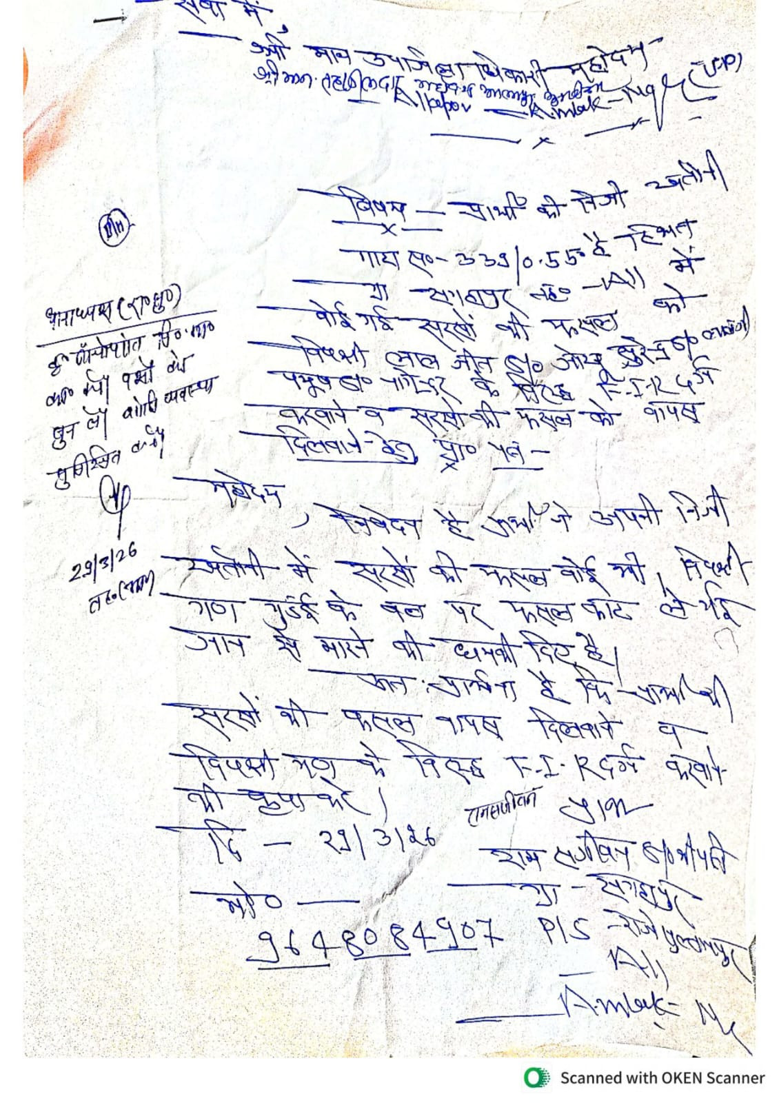 ग्राम सगहापुर निवासी रामसजीवन तिवारी पुत्र श्रीपति ने उपजिलाधिकारी और संबंधित थानाध्यक्ष को दिए प्रार्थना-पत्र में बताया कि वह गाटा संख्या 339, मौजा सगहापुर के संक्रमणीय भूमिधर हैं और खतौनी के अनुसार अपनी भूमि पर वैधानिक रूप से खेती कर रहे हैं। वर्तमान में उनकी सरसों की फसल कट चुकी है और मड़ाई के लिए तैयार है।
