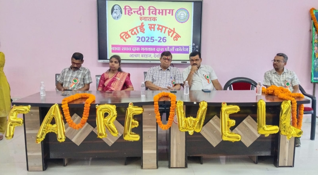 देवरिया।स्थानीय बाबा राघवदास भगवानदास स्नातकोत्तर महाविद्यालय आश्रम बरहज में सोमवार को हिंदी विभाग के स्नातक के विद्यार्थियों द्वारा छठवें सेमेस्टर के विद्यार्थियों के सम्मान में भव्य एवं भावपूर्ण विदाई समारोह का आयोजन किया गया। कार्यक्रम में उत्साह, आत्मीयता और भावनाओं का सुंदर संगम देखने को मिला।