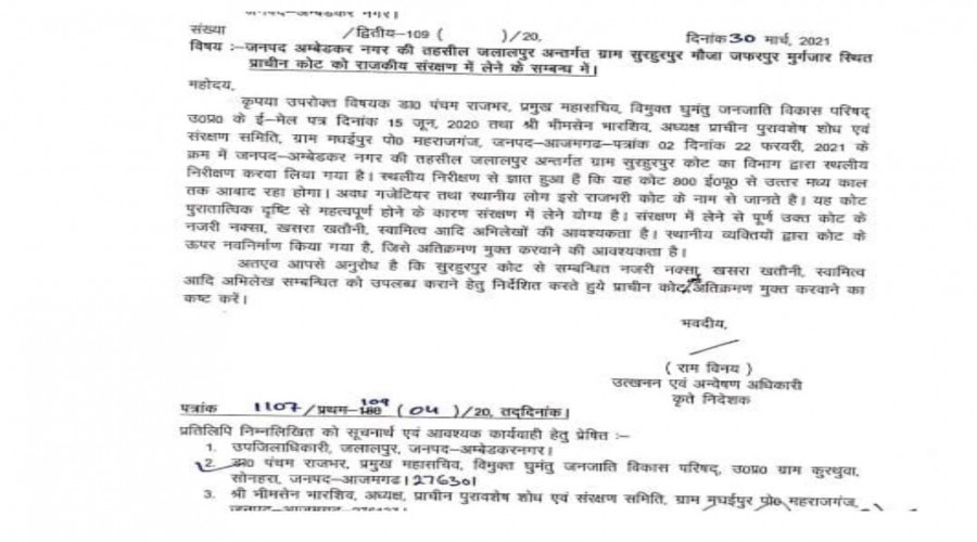 अम्बेडकरनगर । उत्तरप्रदेश राज्य पुरातत्व विभाग ने सुरहुरपुर के मौजा जफरपुर मुर्गजार स्थित किला रू...