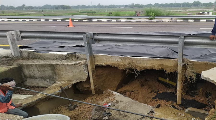आजमगढ़ में धंसा पूर्वांचल एक्सप्रेसवे, मरम्मत में जुटे कार्यदाई संस्था के कर्मी, आवागमन बाधित