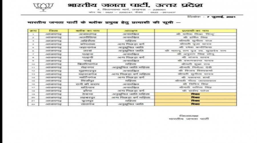 आज़मगढ़ -प्रमुख क्षेत्र पंचायत चुनाव हेतु भाजपा प्रदेश कार्यालय से आज़मगढ़ के विभिन्न ब्लाकों के प्रम...