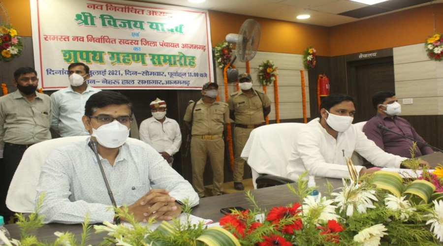 आजमगढ़ नेहरू हाल के सभागार में आयोजित शपथ ग्रहण समारोह में जिलाधिकारी राजेश कुमार द्वारा नव निर्व...