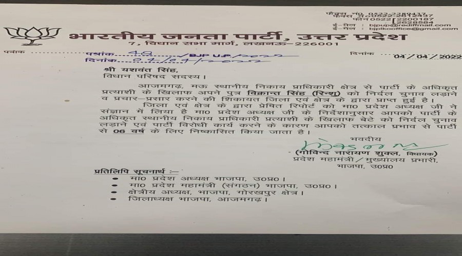 आजमगढ़ : भारतीय जनता पार्टी के विधान परिषद सदस्य यशवंत सिंह को पार्टी विरोधी गतिविधियों के मद्देन...