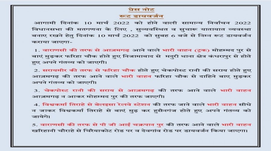 आजमगढ़ जनपद में आगामी दिनांक 10 मार्च 2022 को होने वाली सामान्य निर्वाचन 2022 विधानसभा की...