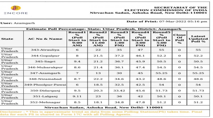 आजमगढ़। जिले के सभी दसों विधान सभा क्षेत्र में सुबह 7 बजे से मतदान जारी है। शाम पांच बजे तक 52.34...