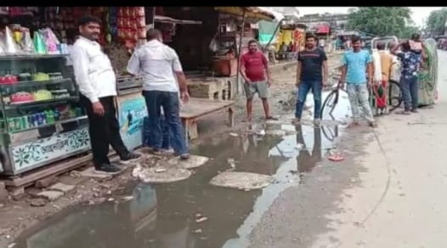आजमगढ़ वाराणसी मुख्य मार्ग पर देवगांव में सड़क की पटरी पर भरा पानी दुकानों पर नहीं चढ़ पारहे हैं...
