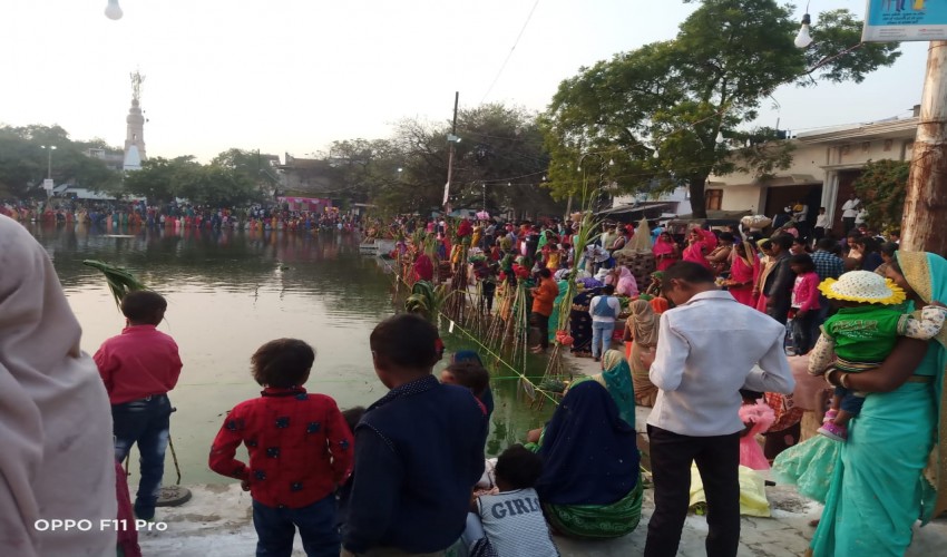 दीदारगंज -आजमगढ़:दीदारगंज क्षेत्र के औरंगाबाद गांव स्थित बजरंगबली मंदिर के पोखरे पर डाला छठ प...