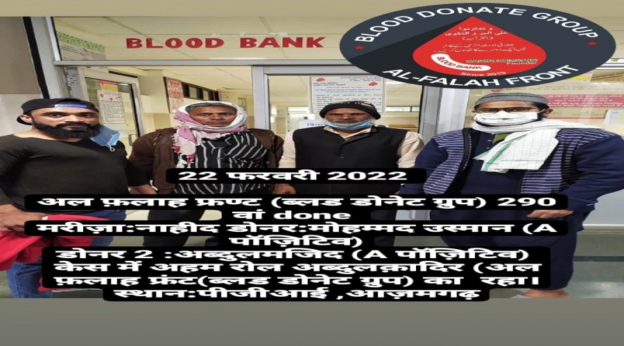 आज़मगढ़,22 फ़रवरी अल फ़लाह फ्रण्ट के ब्लड डोनेट ग्रुप ने एक बार फिर एक मजबूर को रक्त देकर मान...