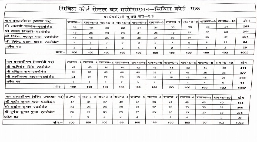 मऊ : सिविल कोर्ट सेंट्रल बार का चुनाव सम्पन्न,मतगणना को लेकर दिन भर बनी रही चहल पहल अध्यक्ष वीरे...
