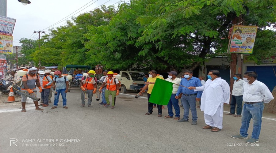 मऊ: नगर के आज़मगढ़ मोढ़ से पालिका कर्मियों को नगर में सैनेटाइज़ेशन का कार्य करने के लिये पालिकाध...