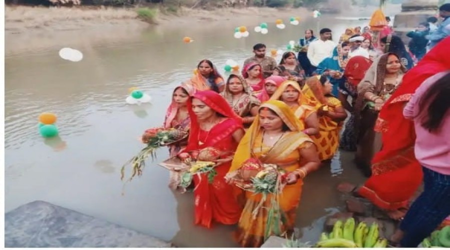 निज़ामाबाद आज़मगढ़।सूर्य षष्ठी पर बुद्धवार की शाम व्रती महिलाओं व श्रद्धालुओं ने अस्चलगामी भगवान भाष...