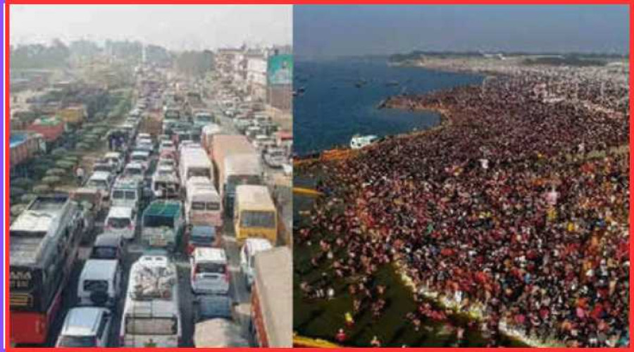उत्तर प्रदेश के प्रयागराज में चल रहे महाकुंभ में श्रद्धालुओं का भारी सैलाब उमड़ा, जिससे प...