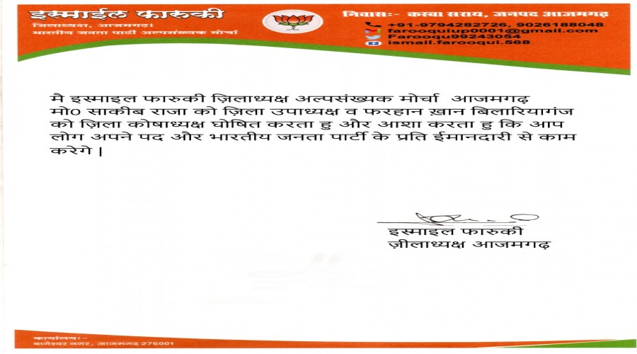 बिलरियागंज -आजमगढ़ : अल्पसंख्यक मोर्चा आज़मगढ़ जिला अध्यक्ष इस्माइल फारुकी को जिलाध्यक्ष बनाया गया...
