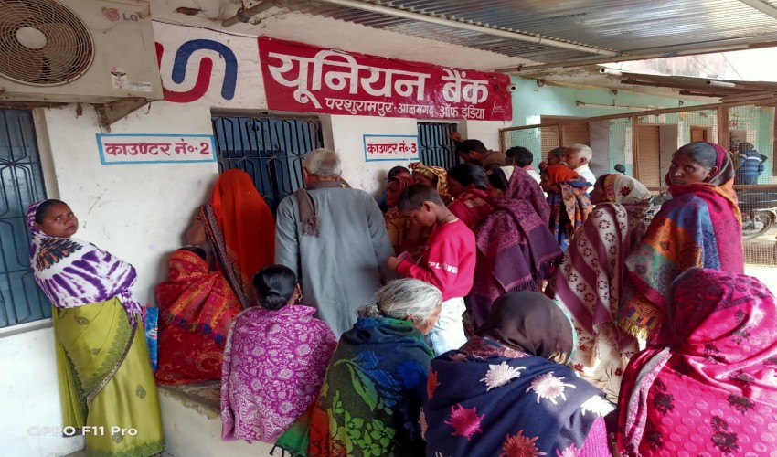 बिलरियागंज आजमगढ़ थाना महाराजगंज के परशुरामपुर में यूनियन बैंक में खाताधारकों की लंबी लाइन...