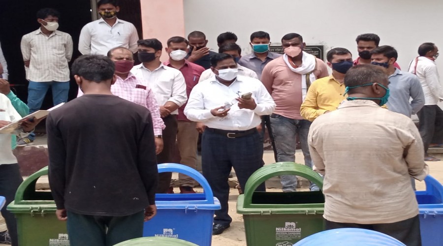 बुढ़नपुर : नगर पंचायत बुढ़नपुर के दुकानदारों को डस्टबिन वितरित करते हुए उप जिलाधिकारी बुढ़नपुर अरव...