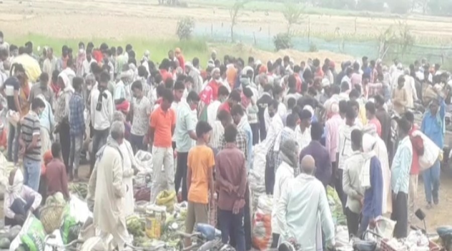 बूढ़नपुर क्षेत्र में बड़ी नवीन सब्जी मंडी पर लोगों द्वारा सोशल डिस्टेंसिंग का पालन नहीं किया जा रह...