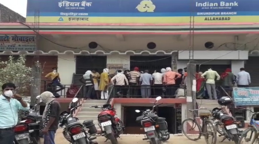 बुढ़नपुर स्थित इंडियन बैंक पर लोगों द्वारा सोशल डिस्टेंसिंग का पालन नहीं किया जा रहा है जिससे कोव...