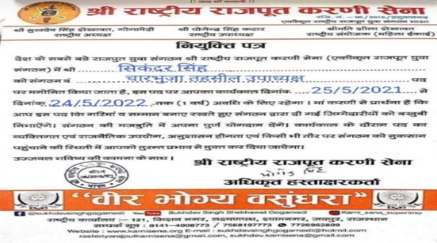 राजस्थान : देश की सबसे बड़ी सामाजिक संस्था श्री राष्ट्रीय राजपूत करणी सेना ने सिकंदर सिंह को चारभ...