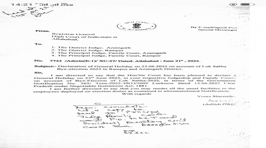 आजमगढ़ : उच्च न्यायालय के आदेशानुसार कल दिनांक 23 /6 /2022 को दीवानी कचहरी आजमगढ़ में अवकाश...