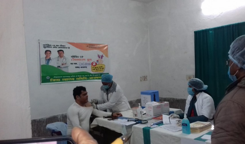 लालगंज (आजमगढ़ )स्थानीय सामुदायिक स्वास्थ्य केंद्र पर कोविड 19के टीकाकरण का शुभारम्भ प्रभारी चिकित्सा...