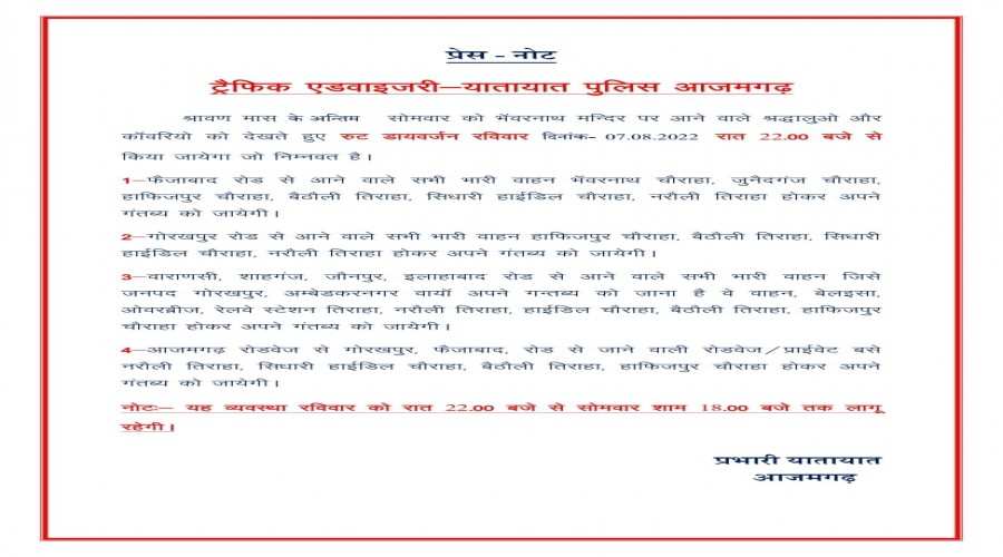 आजमगढ़ यातायात पुलिस द्वारा श्रावण मास के अन्तिम सोमवार को भॅवरनाथ मन्दिर पर आने वाले श्रद्धालुओ औ...