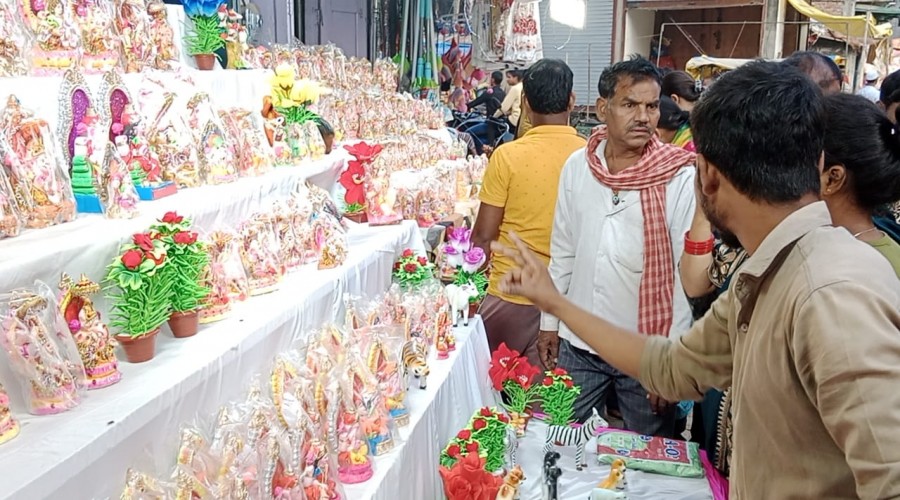 आजमगढ : अम्बारी बाजार में धनतेरस पर देर शाम तक उदासी छायी रही मूर्ति और मिठाइयों की दुकानों पर ग्...