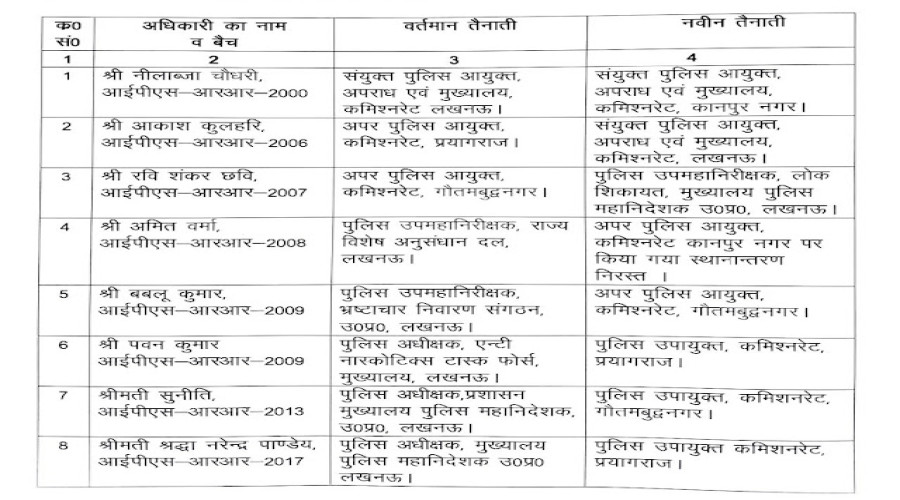 लखनऊ। यूपी में सोमवार को आठ आईपीएस अफसरों के तबादले कर दिए गए हैं। इन अफसरों की सूची जारी कर दी ग...