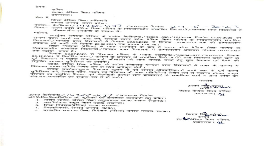 लखनऊ। यूपी में बेसिक शिक्षा परिषद के स्कूलों में गर्मी की छुट्टी दो जुलाई तक बढ़ा दी गई है। सभी स्...
