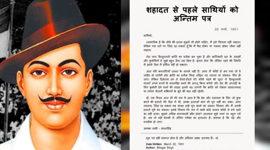 भगत सिंह का अंतिम पत्र उन्होंने 22 मार्च 1931 को फाँसी से एक दिन पहले लिखा था। इस पत्र में उन्होंने अपने विचार, अपने बलिदान का उद्देश्य और समाज के प्रति अपनी आशाएँ व्यक्त की थीं।