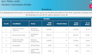 लोकसभा उपचुनाव 2 बजे तक भाजपा प्रत्याशी दिनेश लाल निरहुआ सपा प्रत्याशी धर्मेद्र यादव से 13121 मतों से आगे ....
