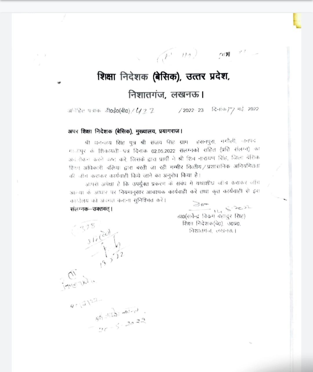बलिया बेसिक शिक्षा अधिकारी बलिया के पद से वरिष्ठ प्रवक्ता डायट प्रयागराज के पद पर जाने के बाद भी तत्कालीन बीएसए शिवनारायण सिंह की मुश्किलें कम होने की बजाय बढ़ती ही जा रही है । इनके साथ ही जिला समन्वयक (सामुदायिक सहभागिता) नुरुल हुदा और जिला समन्वयक (बालिका शिक्षा ) आनंद मिश्र के खिलाफ शिकायतकर्ता धनंजय सिंह की शिकायत (शपथ पत्र के माध्यम से शिकायत)पर शिक्षा निदेशक (बेसिक शिक्षा) सर्वेन्द्र विक्रम बहादुर सिंह ने 17 मई 2022 को अपर शिक्षा निदेशक (बेसिक) प्रयागराज को जांच अधिकारी नामित करते हुए जल्द से जल्द जांच आख्या तलब की है । सबसे पहले जांच अधिकारी रमेश सिंह को बनाया गया था । श्री सिंह ने शिवनारायण सिंह को पत्र जारी कर 8 जून को आरोपों का जबाब देते हुए साक्ष्यों के साथ उपस्थित होने का निर्देश दिये थे । अपर निदेशक का स्थानांतरण जिला विद्यालय निरीक्षक बलिया के पद पर हो जाने के बाद अब यह जांच नये अपर शिक्षा निदेशक (बेसिक )प्रयागराज दिनेश सिंह को सौंपी गई है ।