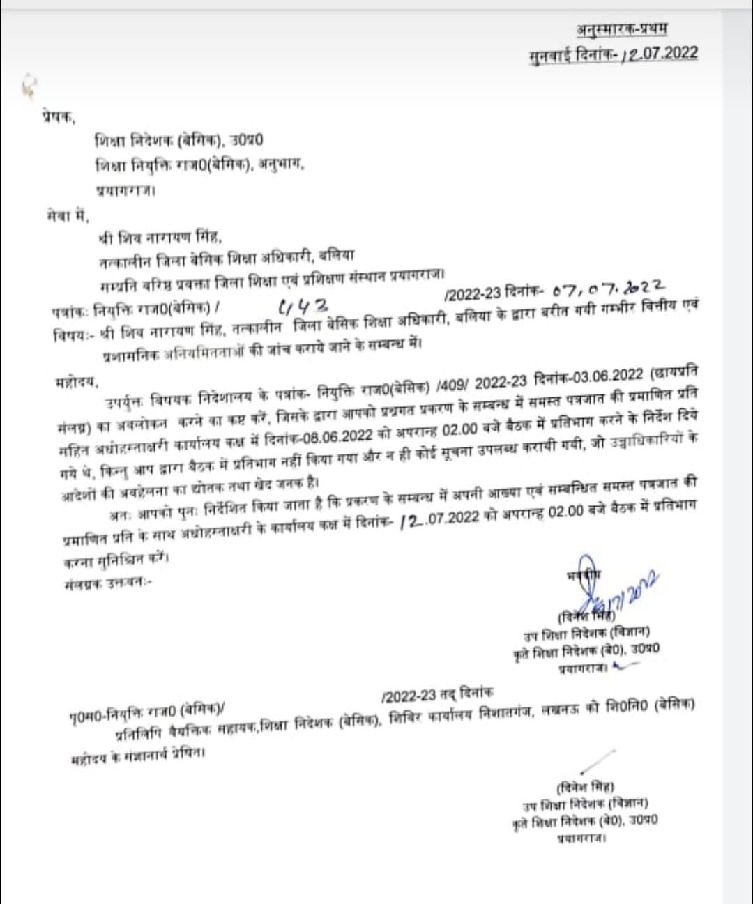 नये जांच अधिकारी दिनेश सिंह ने भी 7 जुलाई 2022 को एक अनुस्मारक पत्र भेजकर 12 जुलाई तक जबाब शिवनारायण सिंह तत्कालीन बीएसए बलिया/वरिष्ठ प्रवक्ता डायट प्रयागराज से तलब किया है । अब देखना है कि इस अनुस्मारक का भी जबाब दाखिल हुआ है कि अगला अनुस्मारक जारी होने की नौबत आएगी ।
