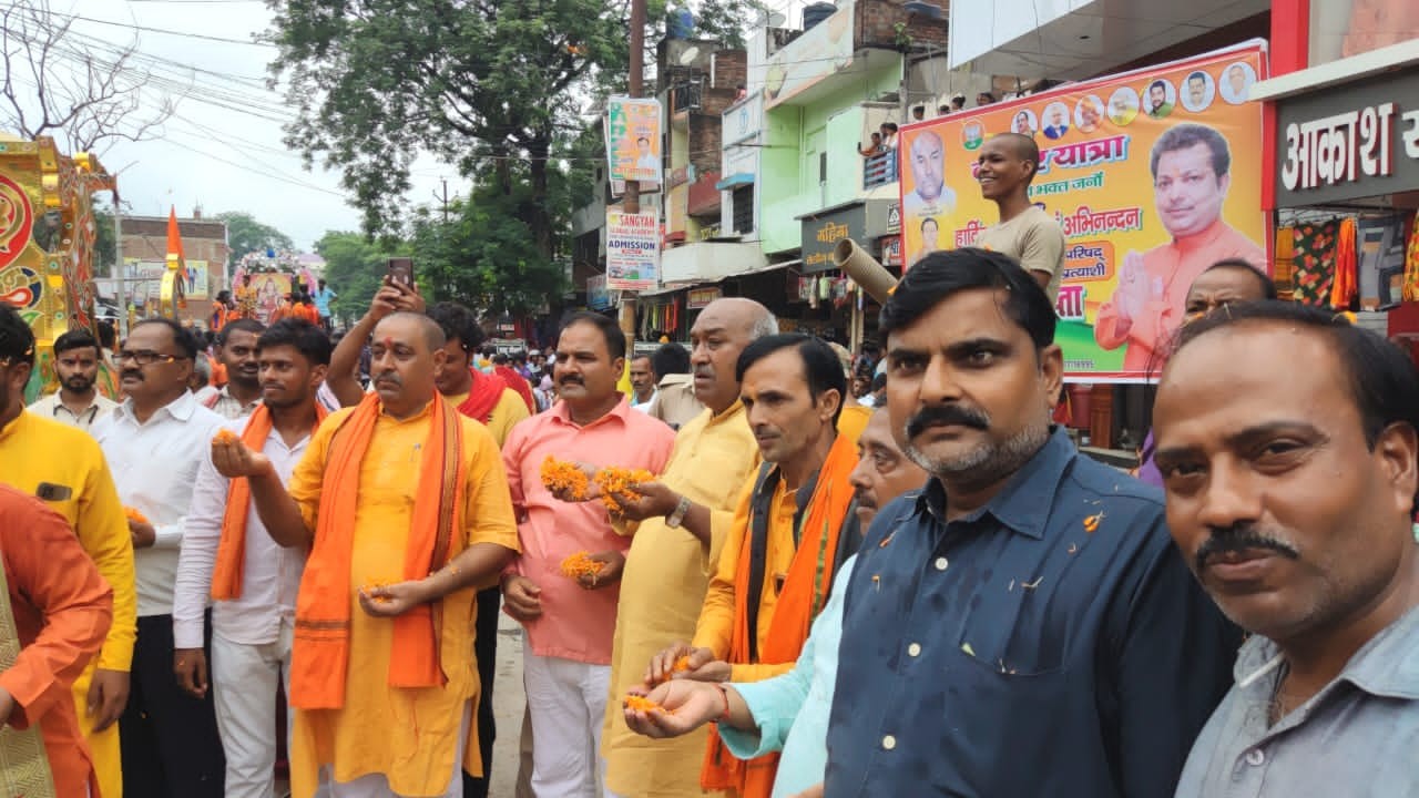 जलालपुर ,अंबेडकर नगर। श्री नवदुर्गा कांवरिया मंडल निशुल्क सेवा समिति के कांवरिया संघ अध्यक्ष जितेंद्र उर्फ सोनू गौड़ के अगुवाई में शिव भक्तों के द्वारा बाबा काशी विश्वनाथ को जलाभिषेक करने के लिए नगर के प्रसिद्ध श्री शीतला माता मठिया मंदिर से पूर्व संध्या पर जल भरकर गुरुवार को दुर्गा माता मंदिर यादव चौराहा से भव्य कांवर यात्रा निकाली गई।भाजपा जिलाध्यक्ष डॉ मिथिलेश त्रिपाठी समेत दर्जनों ने यात्रा का भव्य स्वागत किया। प्रबंधक संतराम जायसवाल एवं व्यवस्थापक विकास निषाद आदि अन्य युवाओं ने व्यवस्था की कमान संभाली। नगर भ्रमण के दौरान बड़ी संख्या में श्रद्धालु शिव भक्तों ने बोल बम व हर हर महादेव के नारों की गूंज के बीच श्रीराम जानकी मंदिर पर विधिवत पूजा अर्चना के साथ शिवलिंग पर जलाभिषेक किया।सजी हुई मनमोहक झांकी के साथ कांवर यात्रा काशी विश्वनाथ धाम जलाभिषेक करने के लिए प्रस्थान कर गई। पूरे नगर में जगह जगह कांवरियों का स्वागत किया गया ।एमएलसी प्रतिनिधि भावी चेयरमैन कृष्ण गोपाल गुप्ता के नेतृत्व में मोहल्लावासियों द्वारा मुख्य अतिथि एमएलसी डॉ हरिओम पांडेय एवं विशिष्ट अतिथि भाजपा नगर अध्यक्ष संजीव मिश्र की मौजूदगी में कांवरियों का स्वागत करते हुए पुष्प वर्षा की गई। पूर्व विधायक सुभाष राय, व्यापार मंडल जिला अध्यक्ष राजेश मिश्र मन्नू, नगर उपाध्यक्ष आशाराम मौर्य, देवेश मिश्र, संदीप गुप्ता ,विपिन,अनुज, विकाश निषाद आदि ने कावरियों और श्रद्धालुओं के बीच सूक्ष्म जलपान पैकेट वितरित किये । वहीं थाने के गेट के बगल से भाजपा नगर मंत्री अमित मद्धेशिया , आनंद जायसवाल, समाजसेवी अजीत निषाद आदि ने विभिन्न स्थानों पर लोगो के द्वारा कांवरियों में मिष्ठान्न वितरित किया गया।