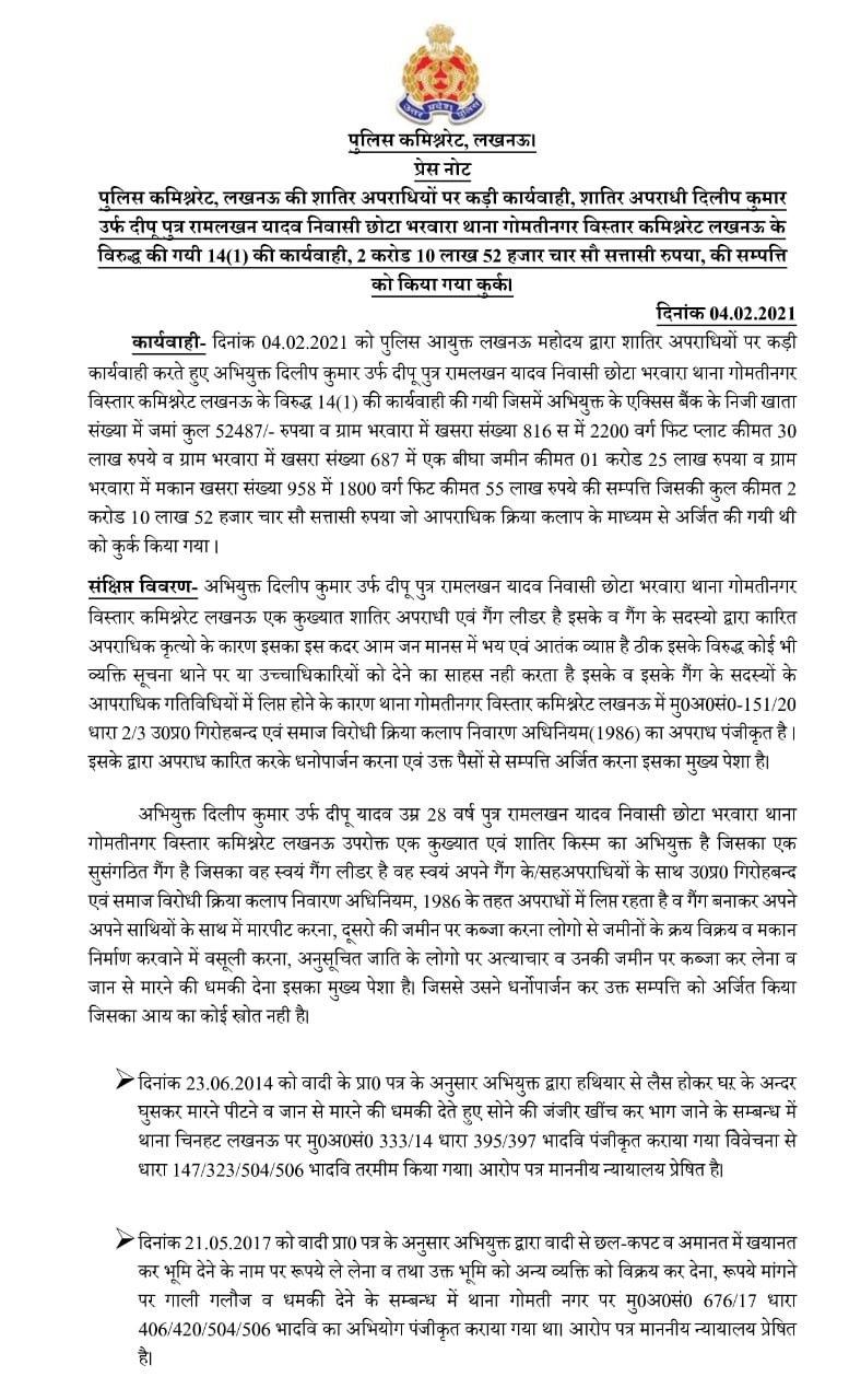 शातिर अपराधी दिलीप कुमार उर्फ दीपू के विरूद्ध की गयी 14(1) की कार्यवाही - लखनऊ