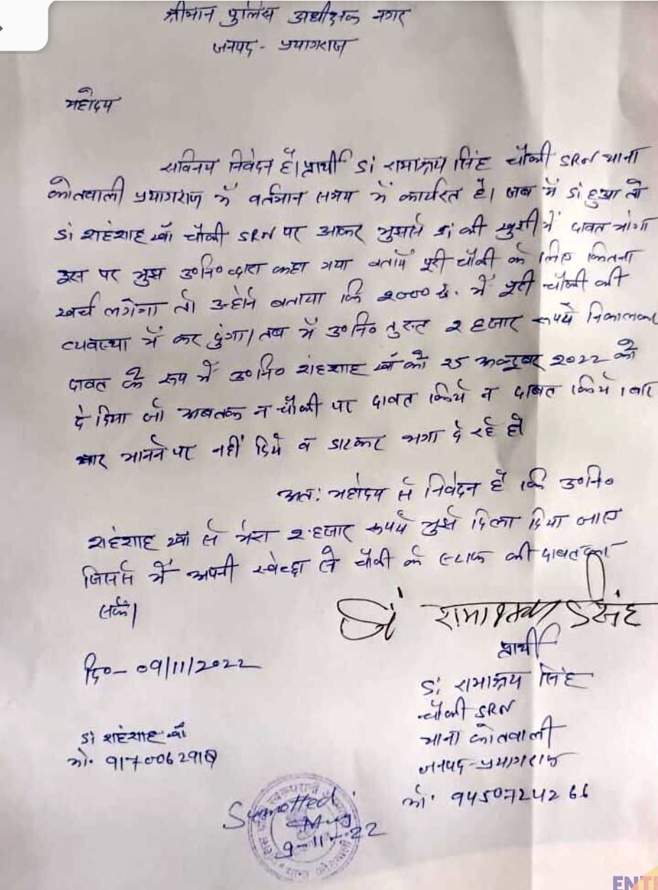 प्रयागराज। उत्तर प्रदेश की प्रयागराज कोतवाली में तैनात एक एसआई का अजब-गजब पत्र वायरल हो रहा है। पत्र में एसआई ने अपने ही विभाग के एक चौकी इंचार्ज पर दो हजार रूपये जब्त करने का आरोप लगाया है। रकम छोटी है बात ये नहीं बल्कि मामले में खास बात तो ये है कि एसआई ने ये दो हजार रूपये चौकी के स्टॉफ को दावत कराने के लिए दी थी, जो चौकी इंचार्ज महोदय ने डकार ली। पत्र के मुताबिक पीड़ित एसआई रामाश्रय सिंह कोतवाली प्रयागराज के अंतर्गत स्वरूप रानी नेहरू यानी एसआरएन चौकी में तैनात है। रामाश्रय सिंह कहते हैं जब वे एसआई बने तो चौकी में ही तौनात एसआई शहंशाह खां ने एसआरएन चौकी आकर उनसे दावत कराने की पेशकश रखी। जिसपर एसआई रामाश्रय सिंह ने पूरी चौकी को दावत करवाने का निर्णय लिया।