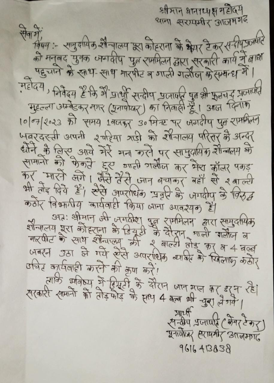 दिनांक 10 जुलाई 2023 को सामुदायिक शौचालय पर अपनी जिम्मेदारी निभा रहा था ऐसे में क्षेत्र के मनबढ़ किस्म का युवक जगदीप पुत्र राममिलन मोहल्ला पूरा कोहराना थाना सरायमीर निवासी ने हमारे ऊपर ड्यूटी समय पर अपने अन्य पांच मित्रों के साथ हमला कर दिए। किसी प्रकार अपनी जान बचाई।