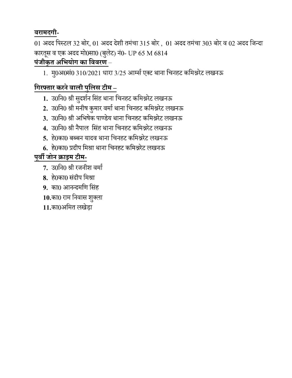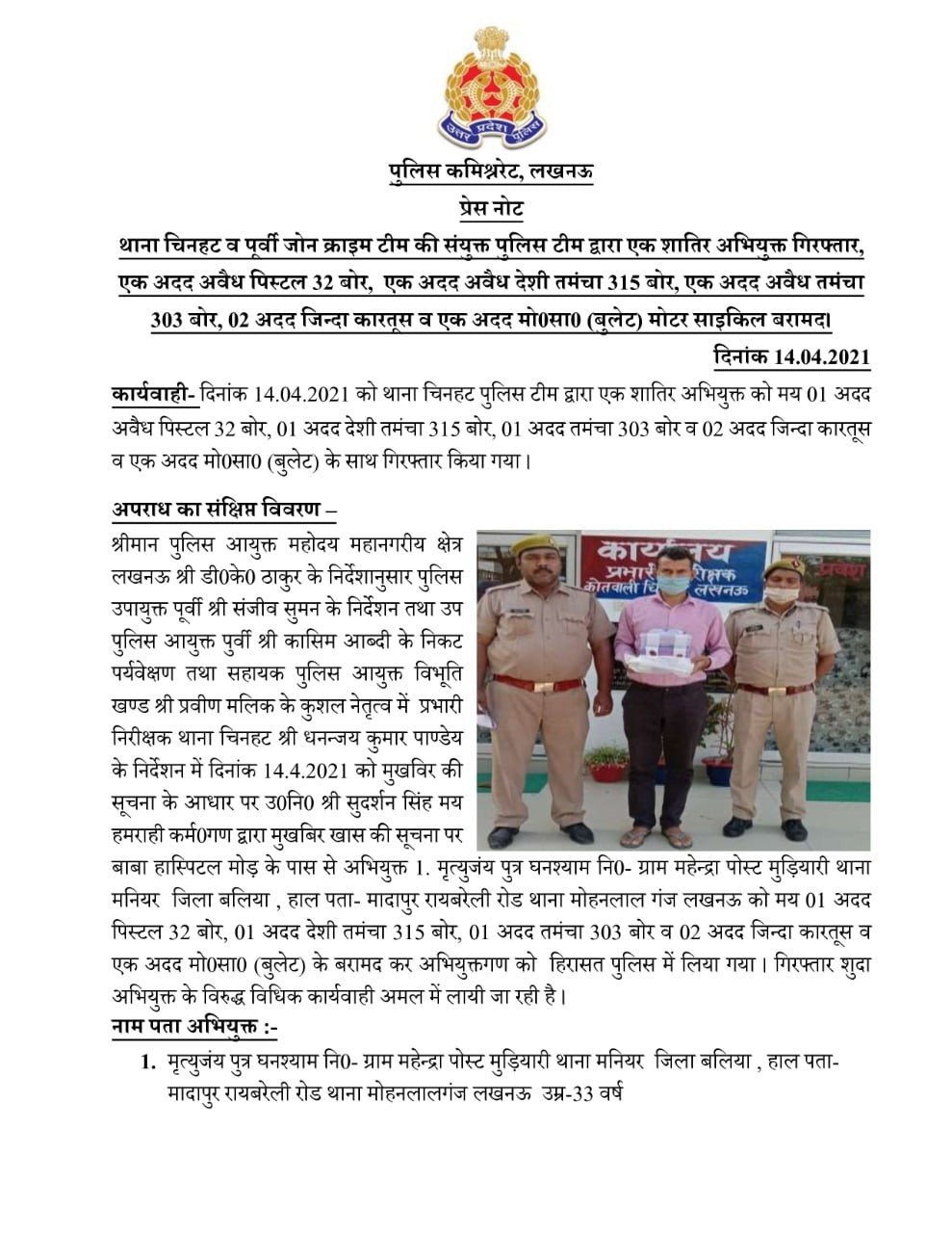 थाना चिनहट व क्राइम टीम (DCP EAST) की संयुक्त पुलिस टीम की सफलता-अवैध पिस्टल, 02 अवैध देशी तमंचा व 01 मोटरसाइकिल समेत 01 शातिर अभियुक्त गिरफ्तार - लखनऊ