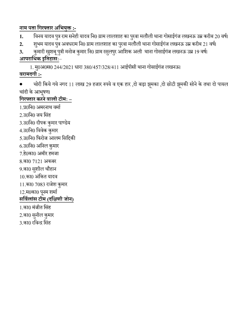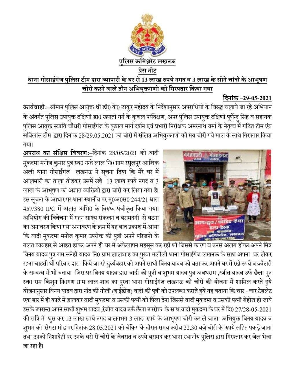 लखनऊ : थाना गोसाईगंज पुलिस टीम द्वारा व्यापारी के घर से 13 लाख रु0 व 03 लाख रु0 के जेवर चोरी करने वाले 03 शातिर अभियुक्त गिरफ्तार। बेटी ने माता -पिता को काढे में बेहोशी की दवा पिलाकर,प्रेमी व उसके दो दोस्तो को बुलाकर करायी थी अपने घर चोरी। प्रेमी के साथ शादी के लिये परिजनो पर बना रही थी दबाब,ना मानने पर मोटी रकम लेकर प्रेमी संग होना चाह रही थी फुर्र। व्यापारी की बेटी सहित प्रेमी व एक साथी को किया गिरफ्तार,एक फरार आरोपी की तलाश में जुटी पुलिस। डीसीपी ख्याति गर्ग व एडीसीपी पुर्णेन्दु सिहं के मार्गदर्शन व एसीपी स्वाति के निर्देशन में गोसाईगंज पुलिस ने चोरी की घटना का सफल अनावरण।