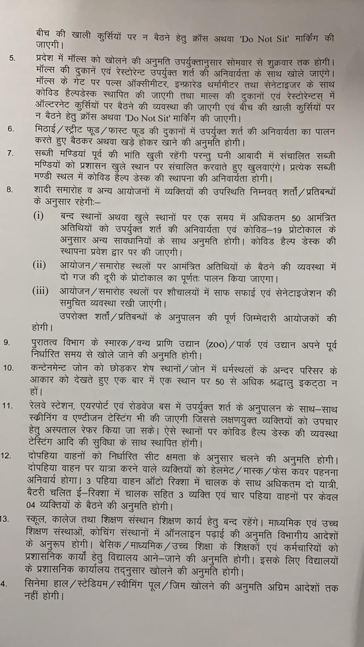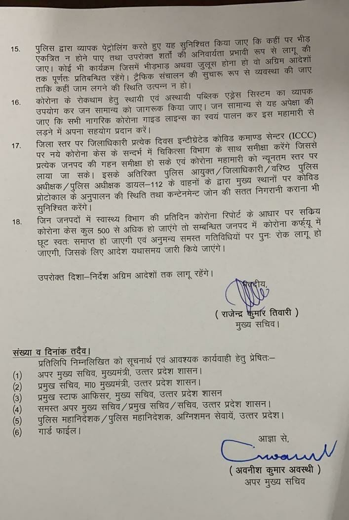 - यदि किसी जनपद में सक्रिय कोरोना मरीजों की संख्या कुल 500 से अधिक हो जाएगी तो उस जनपद में कोरोना कर्फ्यू में छूट स्वतः समाप्त हो जाएगी एवं अन्य समस्त गतिविधियों पर उन्हें रोक लागू हो जाएगी।