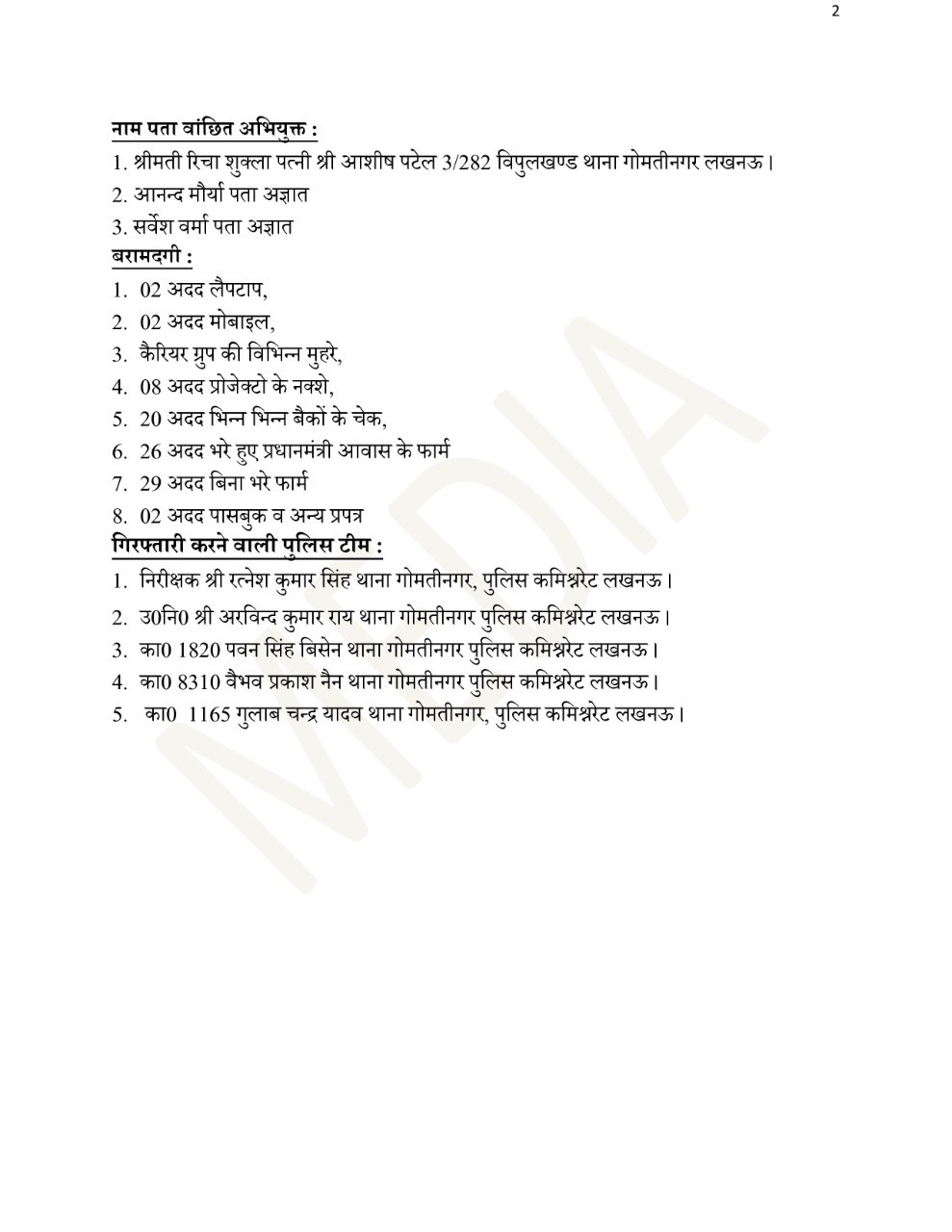 लखनऊ:- पुलिस आयुक्त व संयुक्त पुलिस आयुक्त द्वारा अपराध एवं अपराधियों पर नियंत्रण व वांछित अभियुक्तों की गिरफ्तारी हेतु चलाये जा रहे अभियान के क्रम में पुलिस उप आयुक्त पूर्वी व अपर पुलिस उप आयुक्त पूर्वी के निर्देशन व सहायक पुलिस आयुक्त गोमतीनगर के पर्यवेक्षण एवं प्रभारी निरीक्षक गोमतीनगर के नेतृत्व में थाना गोमतीनगर पुलिस टीम द्वारा प्रधानमंत्री आवास योजना का प्रलोभन देकर रुपए हड़पने वाला शातिर जालसाज गिरफ्तार।
