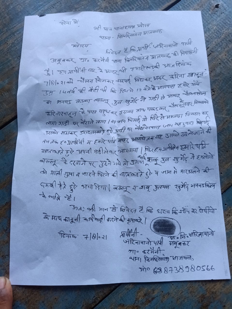 बिलरियागंज/ आजमगढ़ स्थानीय थाना बिलरियागंज के ग्राम करमैनी निवासी जरिना बानो पत्नी अबुबकर ने थाना बिलरियागंज में तहरीर दिया कि मेरी पुत्री करीना खातुन उम्र 14वर्ष आज चैनल खोलकर अंदर बैठी थी कि दिन में करीब 12बजे हमारे गांव का मनबढ़ लडका बब्लू पुत्र खुर्शेद गाड़ी से आकर करिना खातुन के पास पहुच कर हाथ पकड़ कर बाहर लाया और गाड़ी पर बैठाने लगा जब वह चिल्लाई तो तुरंत कट्टा निकाल कर मुझे धमकाने लगा और गाड़ी पर बैठाने लगा तब तक दुबारा चिल्लाई तब तक हम पति-पत्नी आ गये की वह गाड़ी लेकर जाने लगा साथ में मेरे सामने धमकी देते हुए कहा कि मैं तुम्हें उठा ले जाऊंगा की धमकी देते हुए भाग गया जब हम और हमारे पति तुरंत बब्लू के घर पुछने गये तो उसका भाई शब्बु पुत्र खुर्शेद हमे गाली गुप्ता देते हुए जान से मारने की धमकी देने लगा और घर से भगा दिया जिसमें हमने इसकी सूचना बिलरियागंज थाने को दी हैं लेकिन समाचार लिखे जाने तक लड़की की मां जरिना बानो पत्नी अबुबकर ने कहा कि पुलिस जांच करेगी तब कोई कार्रवाई करेगी