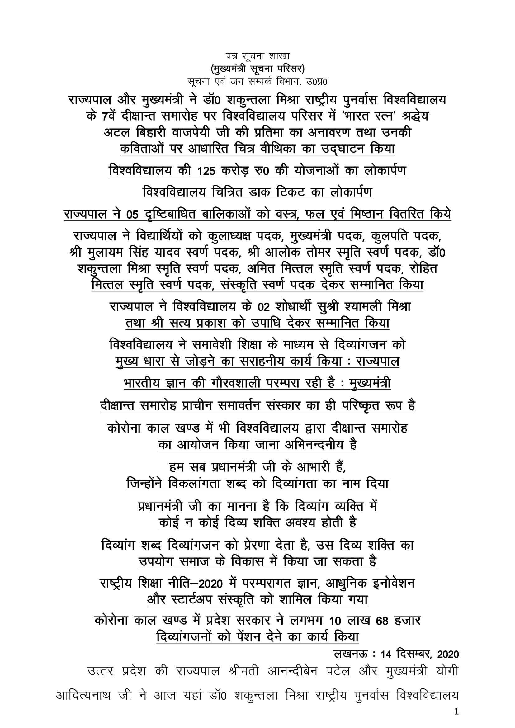 राज्यपाल आनंदीबेन पटेल और मुख्यमंत्री योगी आदित्यनाथ ने डाॅ0 शकुन्तला मिश्रा राष्ट्रीय पुनर्वास विश्वविद्यालय के 7वें दीक्षान्त समारोह को सम्बोधित किया - लखनऊ