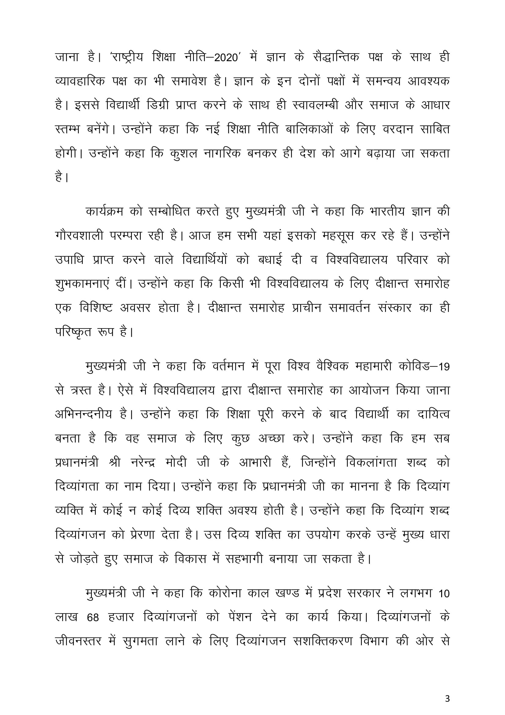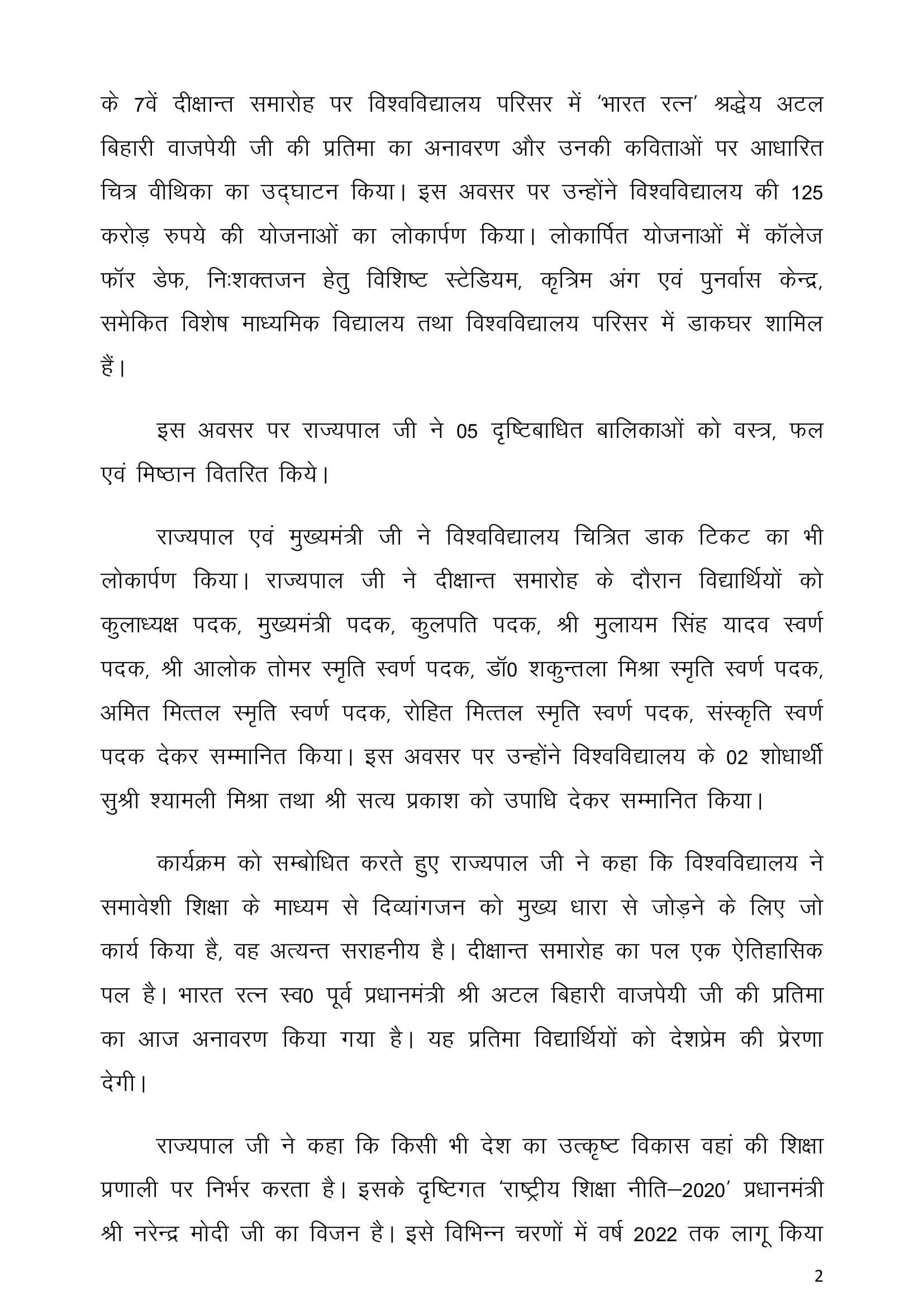 राज्यपाल ने कहा कि इस विश्वविद्यालय से शिक्षा एवं प्रशिक्षण के बाद उपाधि धारकों में एक नई ऊर्जा और आत्मविश्वास का संचार हो रहा है तथा उनके लिएआजीविका, रोजगार एवं स्वरोजगार के अनेक अवसर उपलब्ध हो रहे हैं। उन्होंने विश्वविद्यालय के विद्यार्थियों हेतु विश्वविद्यालय परिसर में डाक-घर का शुभारम्भ किया तथा विश्वविद्यालय पर डाक टिकट निर्गत किया। इसके साथ ही राज्यपाल ने पूर्व प्रधानमंत्री एवं भारत रत्न श्री अटल बिहारी वाजपेयी की प्रतिमा का अनावरण एवं उनकी कविता पर आधारित विथिका का उद्घाटन भी किया। उन्होंने कहा कि स्व0 अटल बिहारी वाजपेयी की यह प्रतिमा विद्यार्थियों को सदैव आगे बढ़ने एवं देश प्रेम की प्रेरणा देती रहेगी।