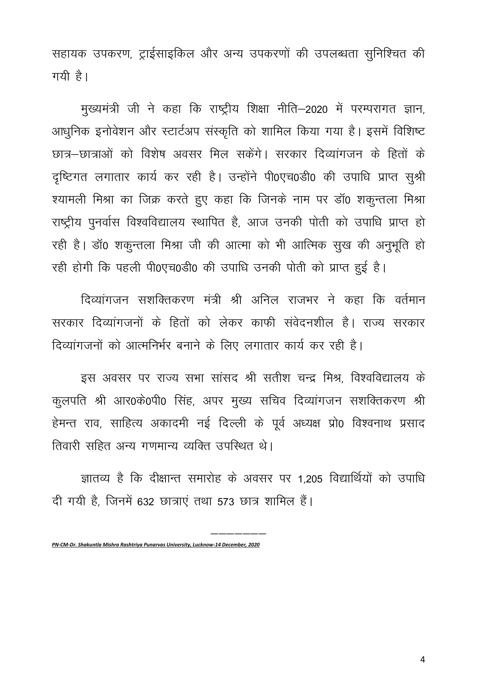 उत्तर प्रदेश की राज्यपाल एवं कुलाधिपति आनंदीबेन पटेल ने डाॅ0 शकुन्तला मिश्रा राष्ट्रीय पुनर्वास विश्वविद्यालय, लखनऊ के सातवें दीक्षान्त समारोह को सम्बोधित करते हुए कहा कि विश्वविद्यालय दिव्यांग विद्यार्थियों में अंतर्निहित विशिष्ट बौद्धिक क्षमता को विकसित कर उन्हें राष्ट्र निर्माण के महान कार्य हेतु गतिशील करने में उल्लेखनीय योगदान दे रहा है।
