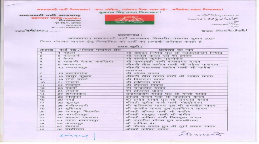समाजवादी पार्टी ने आजमगढ़ में जिला जिला पंचायत सदस्य के लिए जारी की पहली सूची